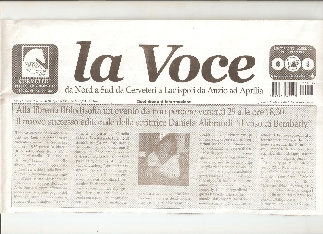Presso la libreria Ilfilodisofia in Viale Roma 27 a Santa Marinella (Rm), verrà presentato venerdì 29 settembre alle ore 18,30 il nuovo successo editoriale della scrittrice Daniela Alibrandi. “Il vaso di Bemberly”, pubblicato nello scorso mese di maggio da L’Erudita marchio Giulio Perrone Editore, sta già riscuotendo infatti un grande successo.