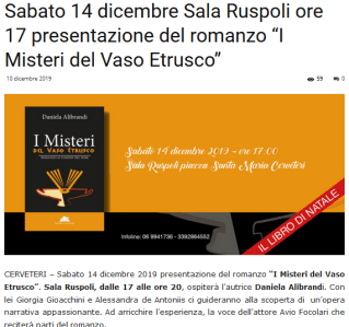 Sabato 14 dicembre 2019 presentazione del romanzo “I Misteri del Vaso Etrusco”. Sala Ruspoli, dalle 17 alle ore 20, ospiterà l’autrice Daniela Alibrandi. Con lei Giorgia Gioacchini e Alessandra de Antoniis ci guideranno alla scoperta di un’opera narrativa appassionante. Ad arricchire l’esperienza, la voce dell’attore Avio Focolari che reciterà parti del romanzo…..