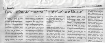 “I Misteri del vaso Etrusco’ racchiude una storia semplice e profonda, in alcuni tratti ai confini del noir. Attraverso una narrazione limpida e senza artifici la trama porta a riscoprire, anche con divertenti e sottili spunti satirici, le dinamiche interpersonali tuttora esistenti di un piccolo borgo. I pettegolezzi, le invidie e le faide famigliari hanno però la capacità di fondersi in una comprensione inaspettata e nel vicendevole aiuto, dando origine a quell’unione che rimarrà l’unica via di sopravvivenza.”
