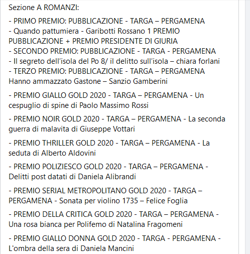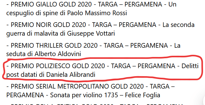 Inviai l’inedito al concorso letterario nazionale Gold Crime Carlo de Filippis, ammirando soprattutto la determinazione con cui si voleva mantenere vivo l’interesse verso la letteratura, seppure in un’atmosfera tanto surreale. “Delitti Postdatati” superò la prima selezione, rientrando tra i primi cinquanta semifinalisti. L’adrenalina cresceva, mentre veniva effettuata una nuova scelta per individuare i primi dieci finalisti. E “Delitti Postdatati” riuscì a passare anche la seconda selezione, aggiudicandosi infine il Premio Poliziesco Gold 2020! Evento di premiazione online, ma non meno emozionante, organizzato perfettamente come del resto tutto lo svolgimento del concorso.