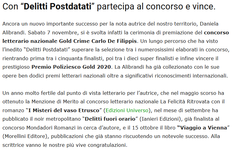 “Delitti Postdatati”, Premio Poliziesco Gold 2020, “Delitti Fuori Orario”, romanzo finalista al concorso Mondadori Romanzi in cerca d’autore e Premio Speciale Giallo Noir al concorso Città di Grottammare, sono presenti in edizione italiana nel catalogo della biblioteca di Hrvard e nella Public Library di New York!