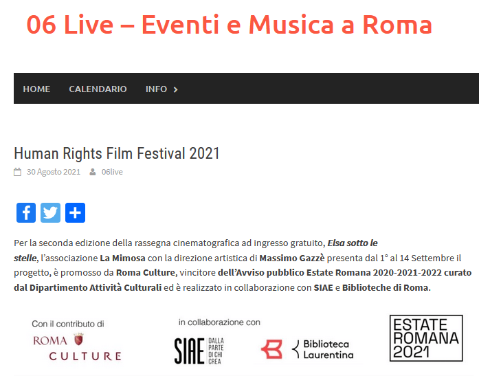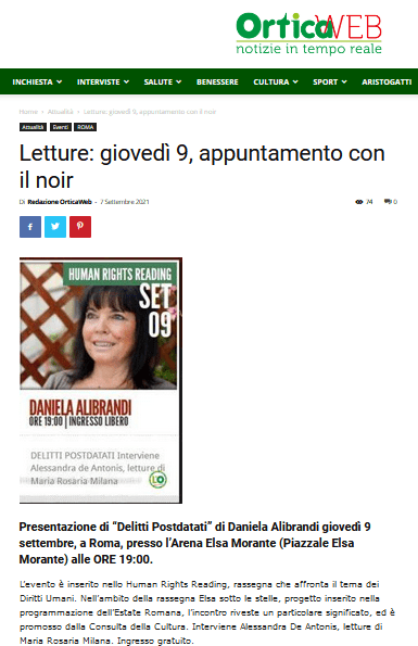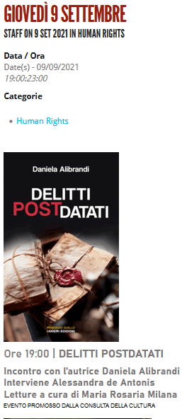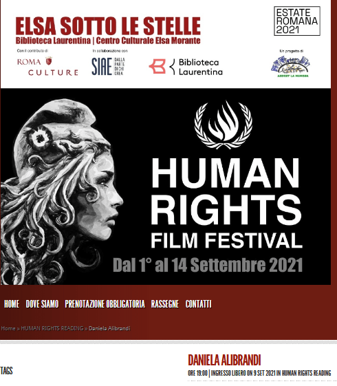 L’ORARIO DI INIZIO DELL’EVENTO E’ ANTICIPATO ALLE ORE 19:00. L’appuntamento è a Roma, presso l’Arena Elsa Morante (Vedi mappa) con il mio romanzo “Delitti Postdatati” (Ianieri Edizioni) per lo Human Rights Reading. Nell’ambito della rassegna Elsa sotto le stelle, progetto inserito nella programmazione dell’Estate Romana, l’incontro riveste un particolare significato. Dal 1° al 14 Settembre è in scena, infatti, lo Human Rights Film Festival, la rassegna sui diritti umani, che propone proiezioni speciali alla presenza di numerose registe, registi e attori e ospita una serie di reading e dibattiti utili a stimolare la riflessione. L’evento è promosso dalla Consulta della Cultura.