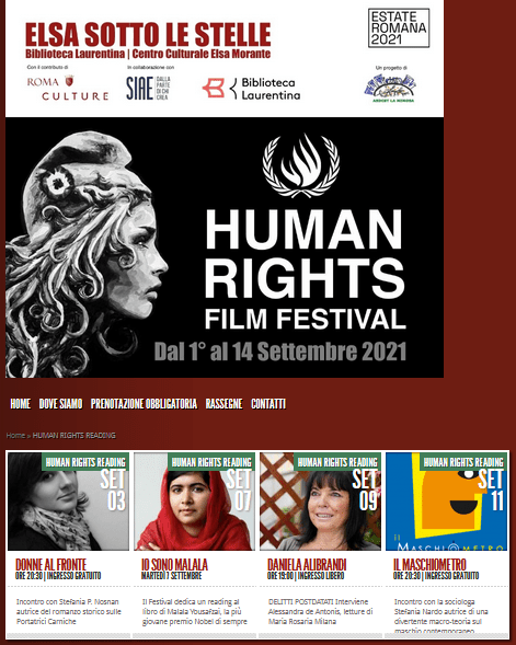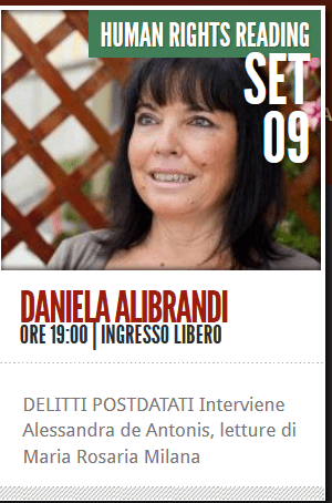 E’ un evento da non perdere! Giovedì 9 settembre, ore 19:00, all’Arena Elsa Morante (vedi Mappa), per lo Human Rights Reading si parlerà dei delicati temi trattati nel mio romanzo “Delitti Postdatati”(Ianieri Edizioni). La rassegna Elsa sotto le stelle, progetto inserito nella programmazione dell’Estate Romana, dedica il periodo dal 1° al 14 Settembre allo Human Rights Film Festival, la rassegna sui diritti umani, che propone proiezioni speciali alla presenza di numerose registe, registi e attori e ospita una serie di reading e dibattiti utili a stimolare la riflessione.