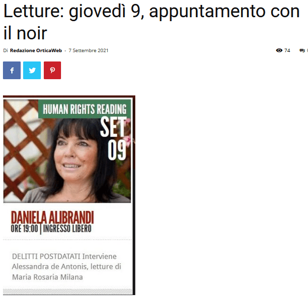 “Delitti Postdatati” ha vinto, come inedito, il Premio Poliziesco Gold 2020 al concorso letterario nazionale Gold Crime di Carlo de Filippis e, dopo la pubblicazione, è stato inserito in importanti rassegne letterarie, come Libri in Strada a Roma, Parole e Musica a Santa Marinella. Pochi giorni fa, il 9 settembre, il romanzo è stato presentato all’Arena Elsa Morante, per lo Human Rights Reading nell’ambito della rassegna Elsa sotto le stelle, progetto inserito nella programmazione dell’Estate Romana. L’ evento è stato promosso dalla Consulta della Cultura.