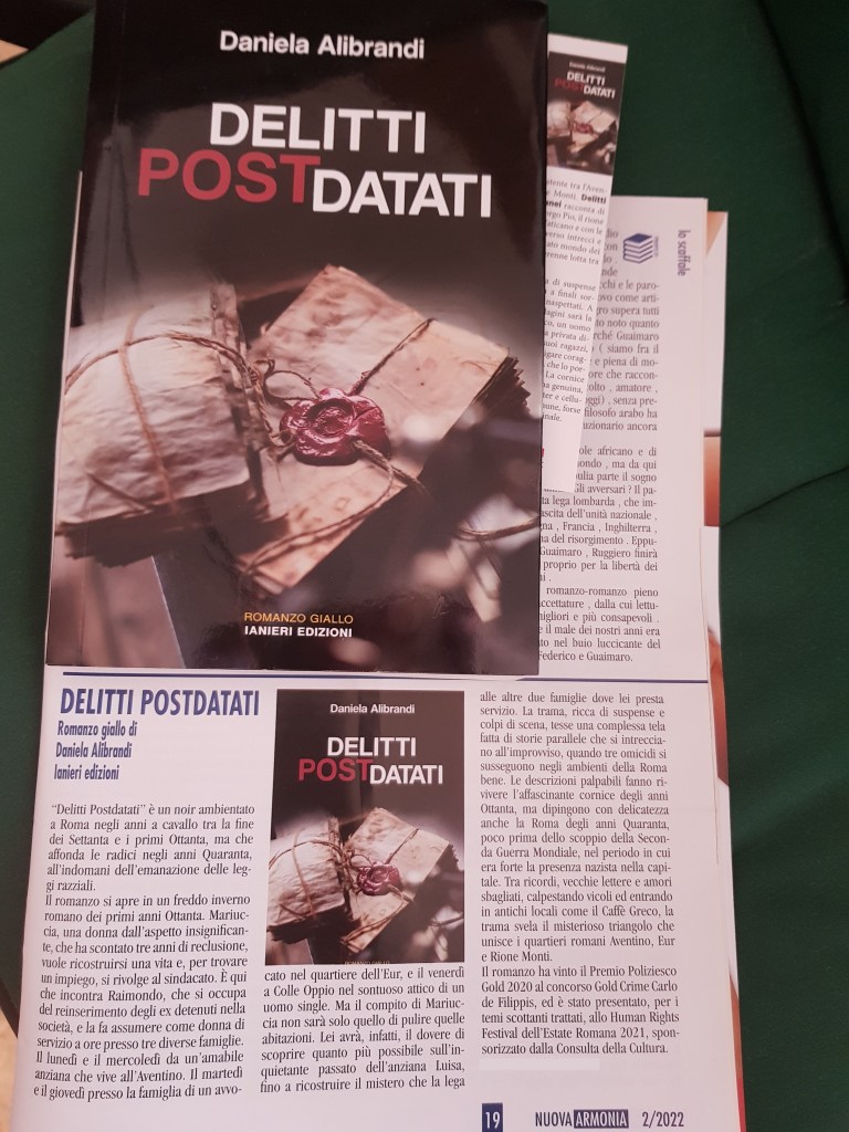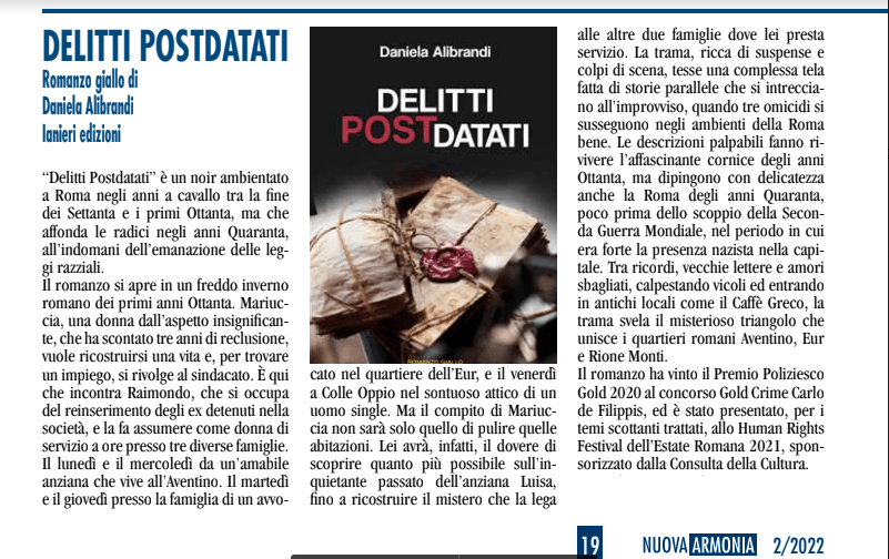 Questa volta a ospitare il mio “Delitti Postdatati” è Lo Scaffale del periodico RAI Nuova Armonia. Uno spazio significativo dedicato alla trama del romanzo che descrive non solo la Roma degli anni Ottanta, ma affonda le radici nell’aprile del Quaranta, all’indomani dell’emanazioni delle leggi razziali e alla vigilia dello scoppio della Seconda Guerra Mondiale, quando era forte la presenza nazista nella capitale.