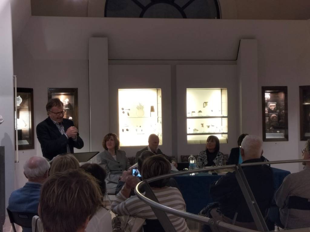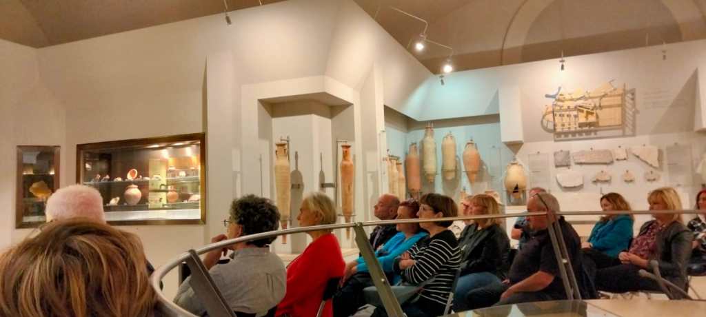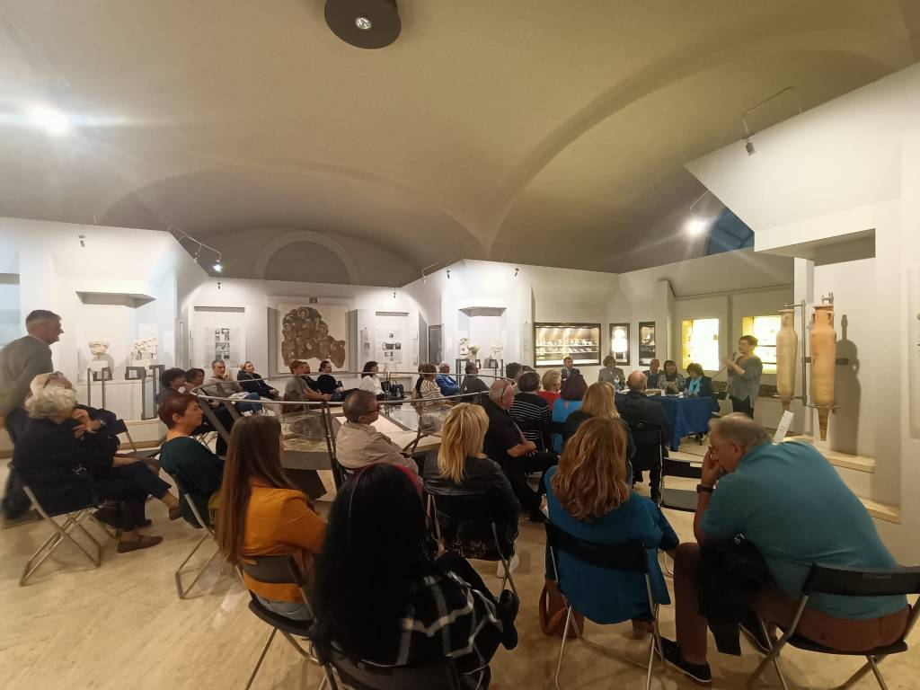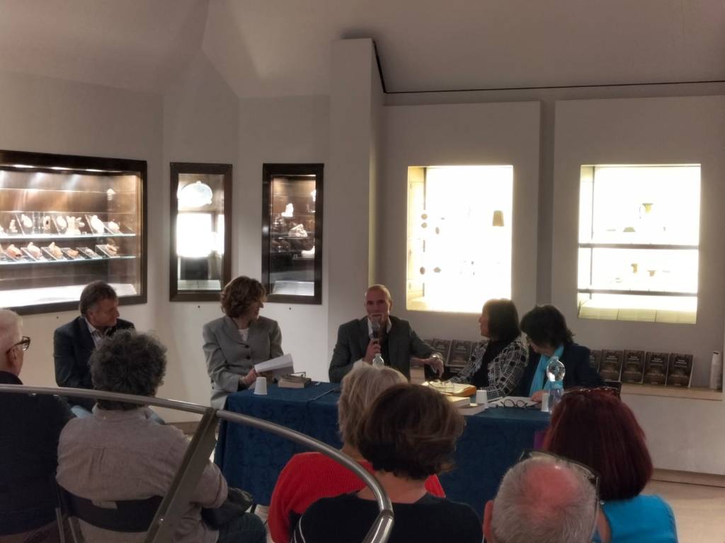 Ci siamo ritrovati nella sala dell’Antiquarium, ricavato nel basamento della sovrastante cappella di San Paolo della Croce, accolti dalla dott.ssa Irene Pignatelli dell’Associazione Cooperativa Culture, che ha organizzato l’evento insieme alla casa editrice Morellini, in un luogo che è Patrimonio del FEC del Ministero dell’Interno. In questa sala sono raccolti i materiali romani e medievali provenienti dagli scavi delle antiche case, realizzati tra il 1887 e il 1936. E che emozione è stata parlare della trama del mio romanzo, di cui molte pagine ambientate proprio in quei luoghi, immersi in una luce soffusa e avvolti da una palpabile emozione. Un dialogo carico di contenuti, tra rilevanti referti di origini antiche, anche di produzione bizantina, ispano-araba e mediorientale, con il grande affresco del XII secolo raffigurante Cristo tra gli arcangeli Michele e Gabriele ed i Santi Giovanni e Paolo sullo sfondo.