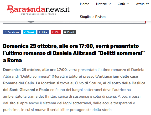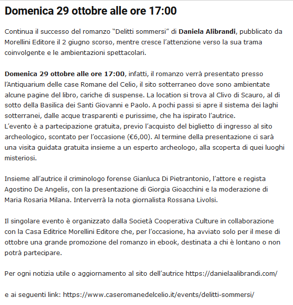 Domenica 29 ottobre, una data che resterà memorabile, non solo per me e per chi ha presentato insieme a me il romanzo “Delitti sommersi” (Morellini Editore), ma anche per le moltissime persone che hanno partecipato al particolare incontro, dove l’interesse letterario si è sapientemente fuso con quello criminologico, storico e archeologico.