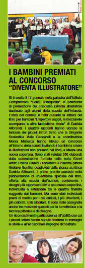 Una palestra invasa da bambini entusiasti ed emozionati, gli sguardi teneri con cui solo i piccoli sanno esprimere sensazioni e sentimenti. Applausi scroscianti di innumerevoli dolcissime mani. I miei lettori, quelli che non mi dimenticheranno mai, gli unici che mi hanno fatto commuovere fino alle lacrime. E la grande soddisfazione di aver visto gli sguardi colmi d’orgoglio di chi veniva premiato, anche se, come è stato più volte detto all’assemblea, i lavori erano tutti bellissimi e di notevole valore artistico. Le classi partecipanti al concorso “Diventa Illustratore” sono state 12, in pratica tutta la scuola primaria dell’I.C. Salvo D’Acquisto di Cerveteri. I circa 260 elaborati sono stati esaminati dalla commissione esterna, composta da nomi eccellenti, quali la nota Street Artist italiana Tiziana Rinaldi Giacometti e l’illustre pittore Giuliano Gentile, a cui mi sono affiancata come autrice dell’opera.