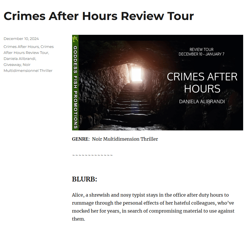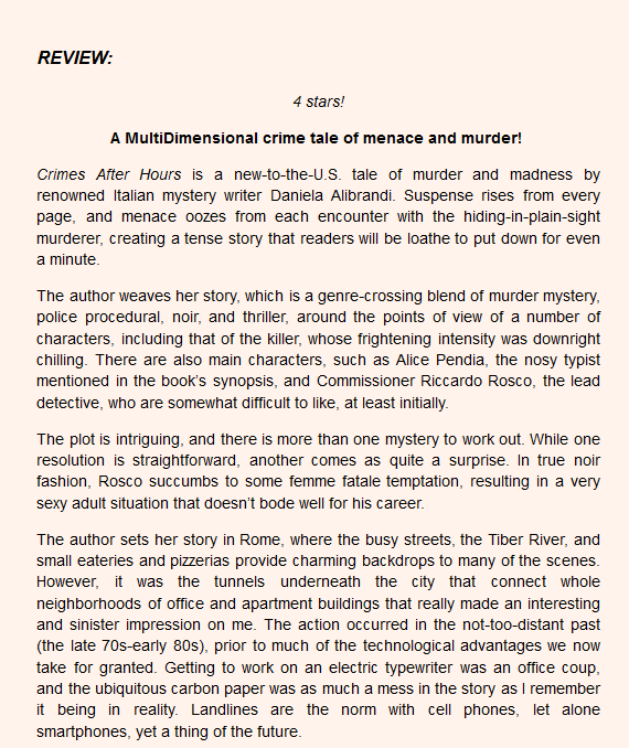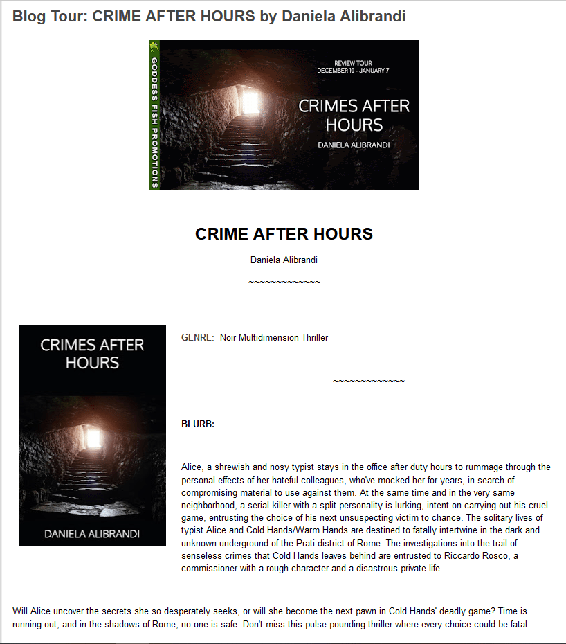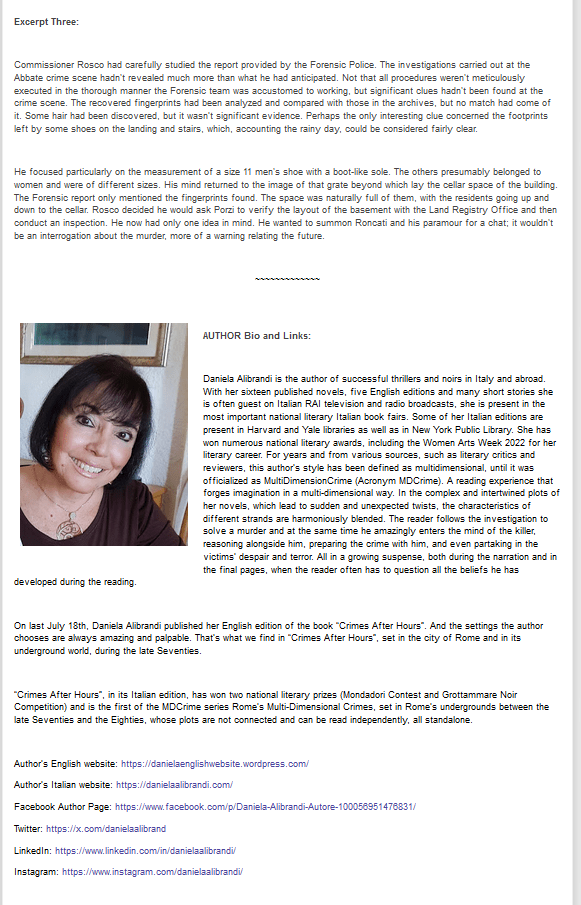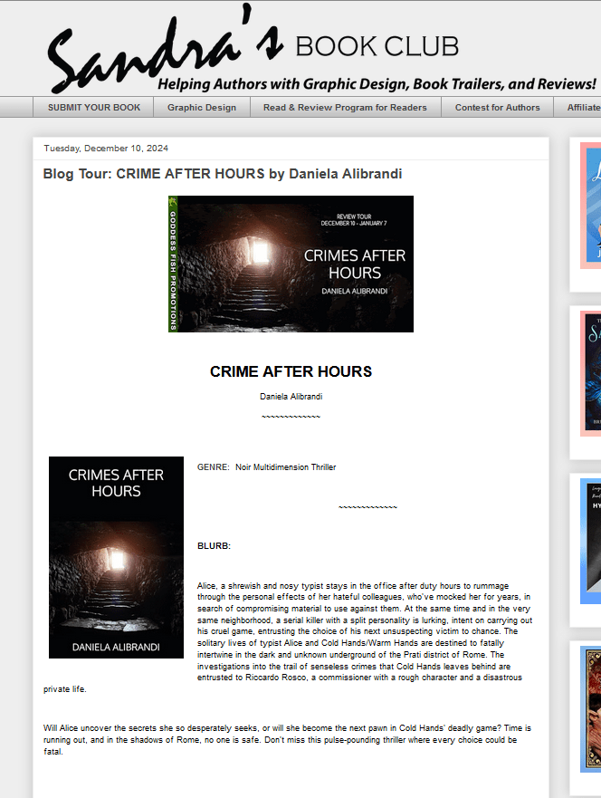 “Furono proprio dei recensori americani, come Bill Snyder, a individuare la multidimensionalità del mio stile e adesso il tour del primo romanzo “Crimes After Hours” (edizione inglese di “Delitti fuori orario- Nuova edizione MultiDimensionCrime) verrà proposto a diversi blog letterari statunitensi, in punti strategici degli Stati Uniti. Abbiamo iniziato con Philadelphia e proseguito in California, ma nella pianificazione ci sono vari stop, compreso il sofisticato New England.”