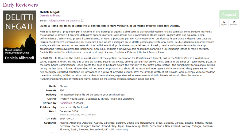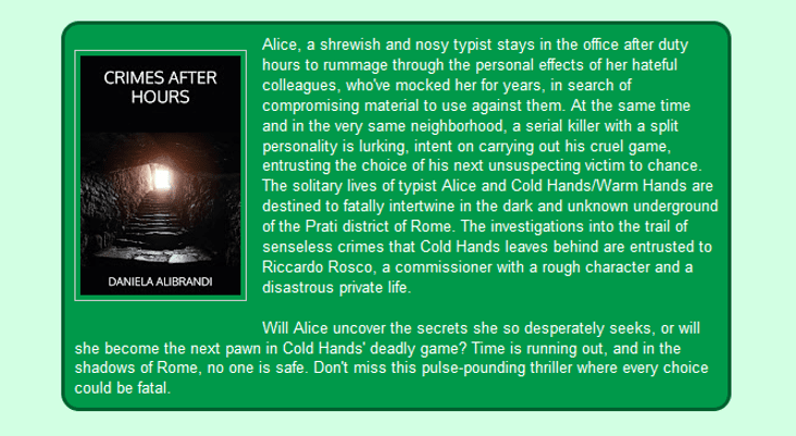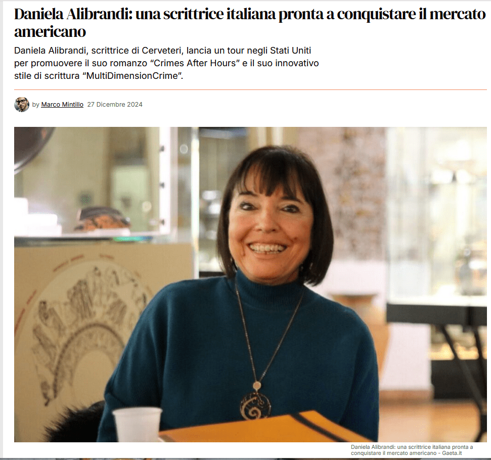 “Daniela Alibrandi, rinomata scrittrice originaria di Cerveteri, si prepara a un’importante campagna di promozione internazionale, puntando decisamente sul mercato editoriale anglosassone, in particolare negli Stati Uniti. Con sedici opere già pubblicate, è una delle autrici italiane più prolifere del suo genere, e ha già visto i suoi lavori tradotti in inglese e ospitati nelle biblioteche di prestigiose università come Harvard e Yale. Il tour letterario che la vedrà protagonista da qui al 7 gennaio rappresenta un’occasione imperdibile per farsi conoscere dal pubblico americano, un traguardo ambito da molti scrittori”.