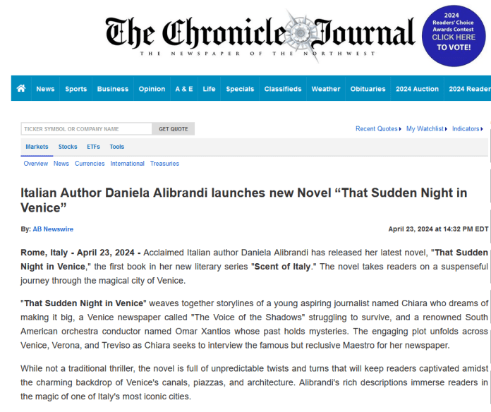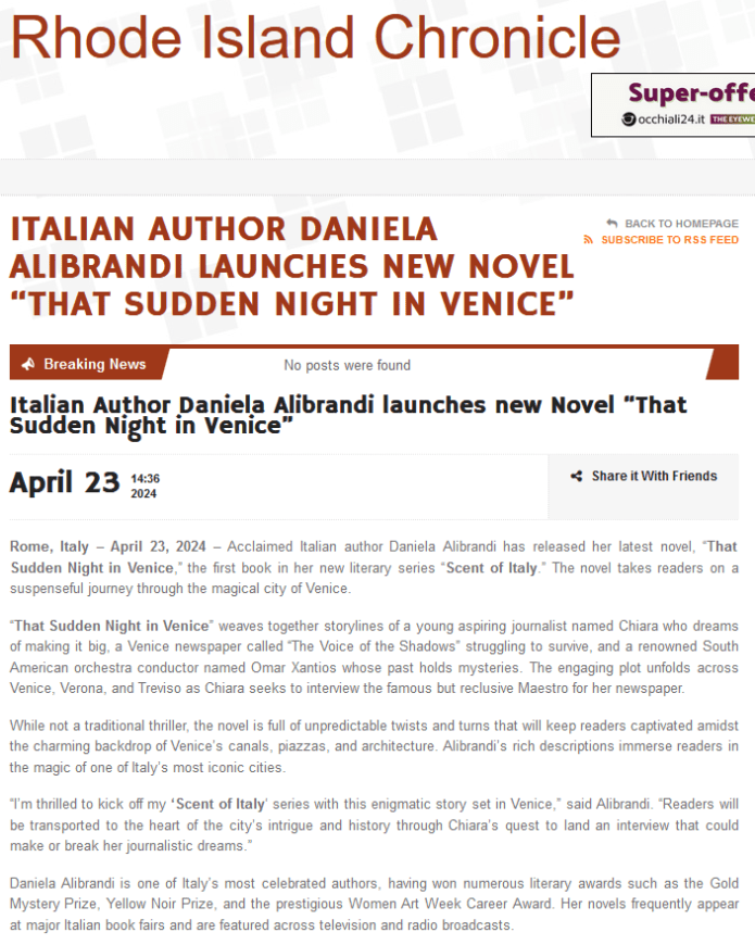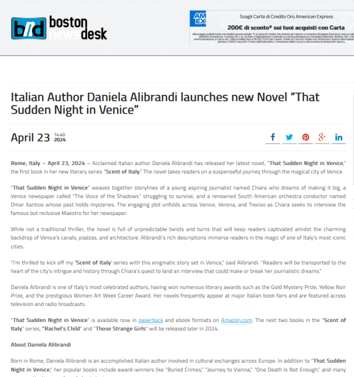 Dal 29 marzo al 2 aprile ai lettori di Barnes & Noble è dedicata la super offerta per l’edizione inglese di “Quella improvvisa notte a Venezia”, “That Sudden Night in Venice”. Il numero del codice coupon è BNPROSY28, e il link al romanzo è il seguente: https://www.barnesandnoble.com/w/that-sudden-night-in-venice-daniela-alibrandi/1145022687?ean=2940184668574