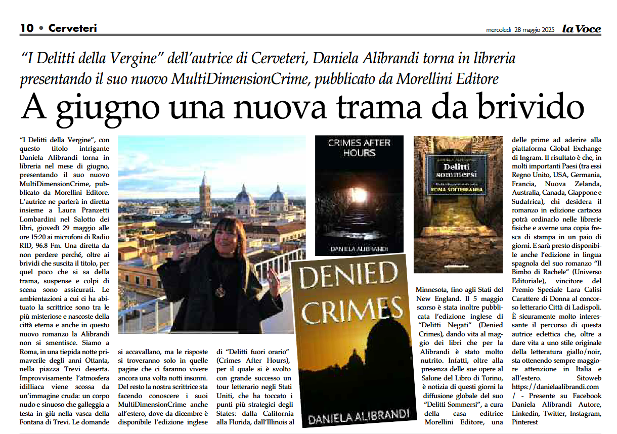 E’ così che è stato presentato in anteprima assoluta “I Delitti della Vergine”, il mio nuovo MultiDimensionCrime, pubblicato da Morellini Editore in uscita il 27 giugno. Ed è stato descritto con le sue sfumature noir, la trama gialla coinvolgente, la suspense crescente degna di un thriller psicologico e le seducenti ambientazioni sotterranee dell’acquedotto Vergine. Piazza Trevi è deserta, ma l’immagine di un cadavere che galleggia nella fontana graffia quella pace. Ascoltate il podcast della trasmissione, colma di contenuti interessanti. La mia intervista inizia al minuto 5′ e termina al 18′ circa: