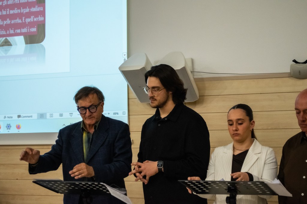 Il regista Agostino De Angelis e gli attori della Academy for Theater, Cinema and Cultural Heritage Stefano Ercolani, Riccardo Frontoni e Samira Ercolani hanno dato vita alle pagine più drammatiche e significative del romanzo. Una recitazione che ha travolto il pubblico presente, soprattutto nelle parti in cui si descriveva il delitto visto dagli occhi del killer e nella disperazione della vittima. Questo ha dato modo di spiegare nel dettaglio l’innovazione dello stile MultiDimensionCrime, che porta il lettore a indagare con la squadra, a vedere con gli occhi dell’assassino e a disperarsi con l’animo della vittima, in un crescendo di suspense e colpi di scena. Una lettura che non permette di essere lasciata fino all’ultima pagina, nella quale il lettore deve spesso ricredersi delle convinzioni fin lì acquisite.