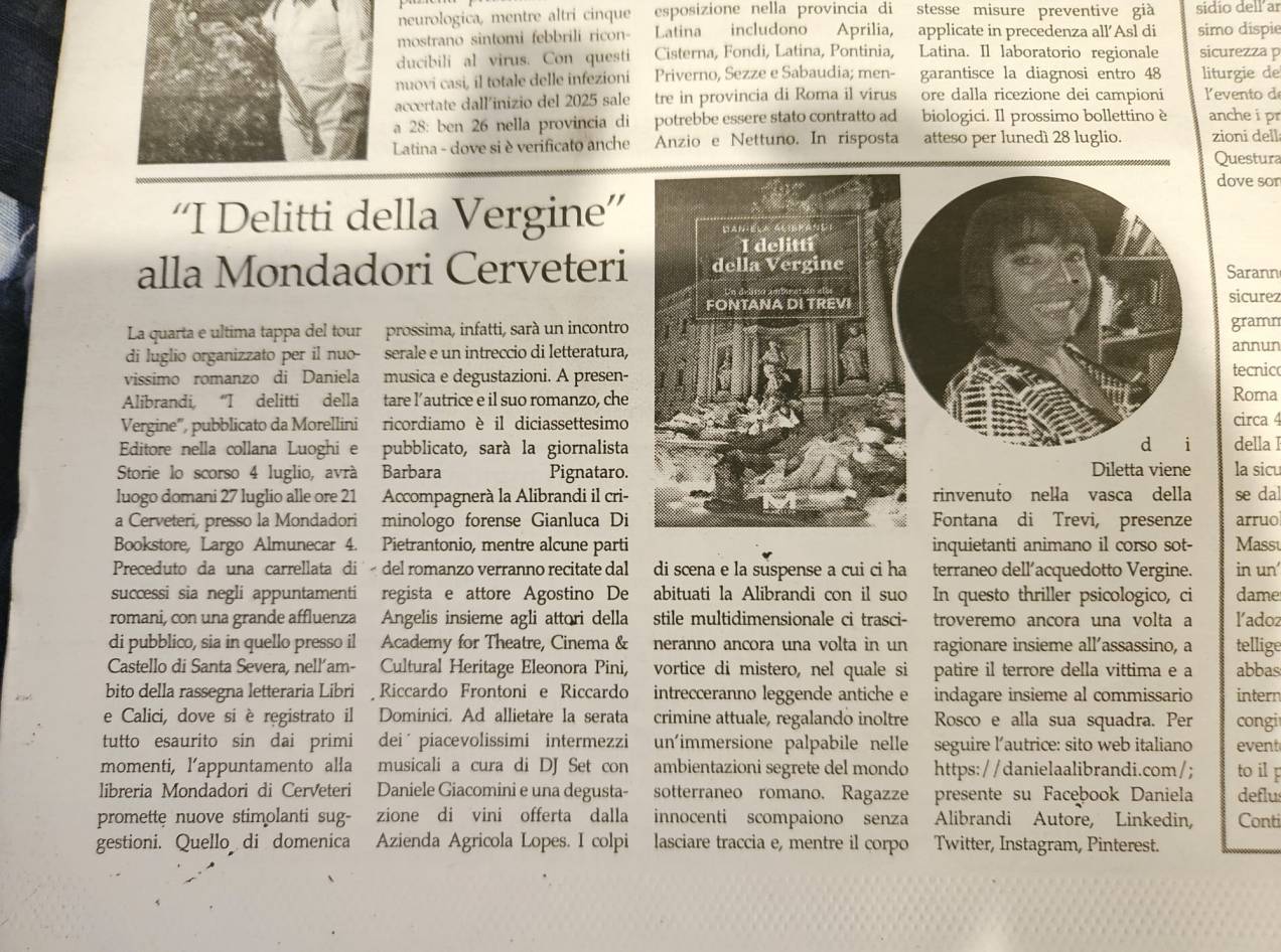 Vi aspetto stasera alle ore 21:00 presso il Mondadori Bookstore di Cerveteri, Largo Almunecar 4 con “I delitti della Vergine” (Morellini Editore). Con me la giornalista Barbara Pignataro, il criminologo forense Gianluca Di Pietrantonio, il regista e attore Agostino De Angelis insieme agli attori della Academy for Theatre, Cinema & Cultural Heritage. Ad allietare la serata verrà offerta dalla Azienda Agricola Lopes la degustazione di vini, con gradevoli intermezzi musicali a cura del DJ Set con Daniele Giacomini.