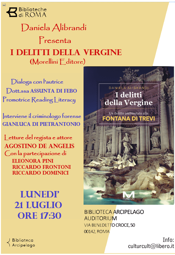 Lunedì 21 luglio, alle ore 17:30 vi aspetto alla Biblioteca Arcipelago Auditorium di Roma, Via Benedetto Croce 50. Una location eccezionale, con parcheggio e aria condizionata. Evitate di trascorrere un noioso pomeriggio chiusi in casa con il caldo. Vi aspettiamo per un evento molto particolare, dove alla presentazione del romanzo “I delitti della Vergine”, pubblicato da Morellini Editore lo scorso 4 luglio nella collana editoriale Luoghi e Storie, si abbinerà la recitazioine teatrale degli attori della Academy for Theatre, Cinema & Cultural HeritageEleonora Pini, Riccardo Frontoni e Riccardo Dominici, insiema al regista e attore Agostino De Angelis.