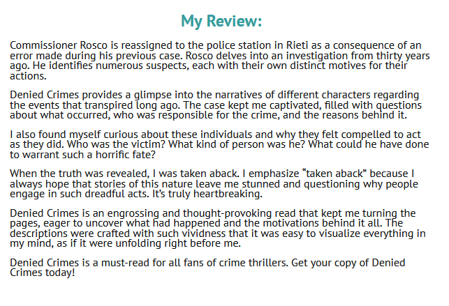 Il commissario Rosco viene riassegnato alla stazione di polizia di Rieti a seguito di un errore commesso durante il suo precedente caso. Rosco approfondisce un’indagine di trent’anni prima. Identifica numerosi sospettati, ognuno con le proprie motivazioni distintive. Denied Crimes offre uno sguardo sulle narrazioni di diversi personaggi in merito a eventi accaduti molto tempo fa. Il caso mi ha tenuto incollata allo schermo, pieno di domande su cosa fosse successo, chi fosse il responsabile del crimine e le sue motivazioni. Mi sono anche ritrovata incuriosita da queste persone e dal perché si sentissero spinte ad agire in quel modo. Chi era la vittima? Che tipo di persona era? Cosa avrebbe potuto fare per giustificare un destino così orribile? Quando la verità è stata svelata, sono rimasto sbalordita. Sottolineo “sbalordita” perché spero sempre che storie di questo tipo mi lascino sbalordita e mi facciano chiedere perché le persone si impegnino in azioni così orribili. È davvero straziante. “Denied Crimes” è una lettura avvincente e stimolante che mi ha tenuto incollata alle pagine, desiderosa di scoprire cosa fosse successo e le motivazioni dietro tutto. Le descrizioni erano realizzate con tale vividezza che era facile visualizzare tutto nella mia mente, come se si stesse svolgendo proprio davanti a me. “Denied Crimes” è una lettura obbligata per tutti gli appassionati di thriller polizieschi. Acquista subito la tua copia di “Denied Crimes”!