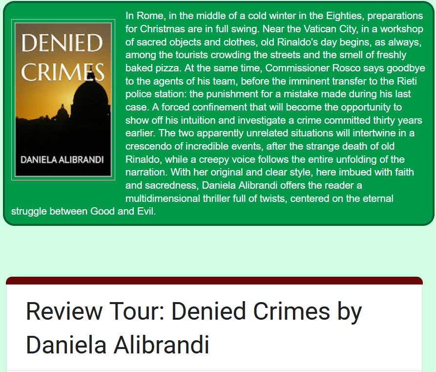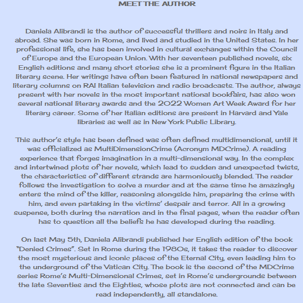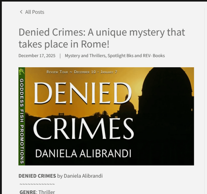 “Denied Crimes” di Daniela Alibrandi è un romanzo giallo/poliziesco che segue un crimine a Roma, con scene molto vivaci che si possono vedere durante la lettura. Il libro è ambientato a Roma, in Italia, tra la fine degli anni ’70 e gli anni ’80. La storia è raccontata in un modo narrativo nuovo, che ci offre una visione multidimensionale della vicenda. Rosco è il protagonista del primo capitolo, che viene trasferito in un piccolo distretto di una cittadina/paese italiano, lontano da Roma. La scrittura è splendidamente descrittiva in questo libro e non si può fare a meno di lasciarsi trasportare da Roma e dai luoghi italiani descritti. Il finale è perfetto per Rosco e Marilena. Lo consiglio agli appassionati di gialli unici e di ambientazioni europee splendidamente descritte!