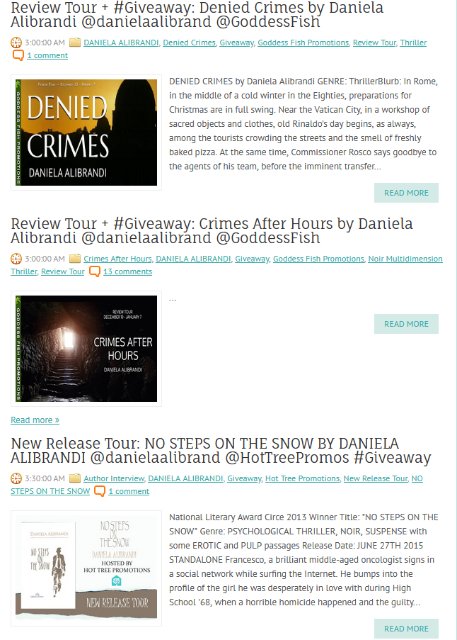 Il tour è stato organizzato dalla Goddess & Fish Promotion, che già si era occupata lo scorso anno di “Crimes After Hours” (edizione inglese di “Delitti fuori orario”). Il tour di “Denied Crimes” si è concluso il 7 gennaio scorso e pure questa volta si è rivelato un’occasione importante e costruttiva, anche se il necessario impegno personale ha sconvolto i miei ritmi biologici circadiani di sonno/veglia, tenendomi sveglia per molte nottate, visto il fuso orario con le varie località statunitensi.